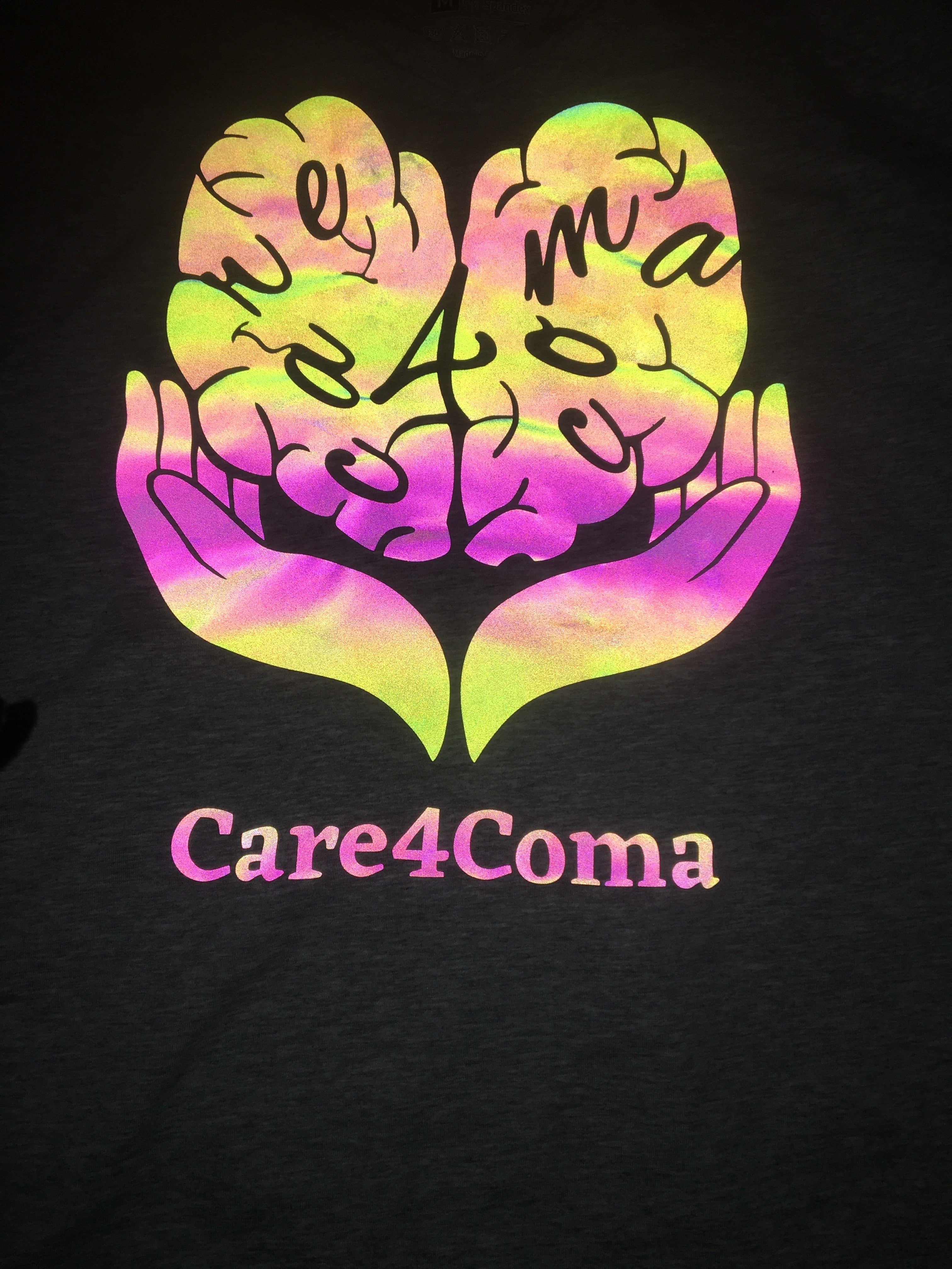 I designed these t-shirts for caregivers and survivors of all types, and as an homage to my mom. A strong survivor of a brain injury who defied the odds and fought hard when many doubted her survival. The Care4Coma logo is a symbol of hope, hands holding a heart shaped brain showing when caring for loved ones it takes; hope, heart, knowledge and care. My unique t-shirts change in the light, watch the colours glow. I wanted to create something that is unique and encompasses the uniqueness of the wearer, you are a survivor, you are a caregiver, you are loved, you are a carer.